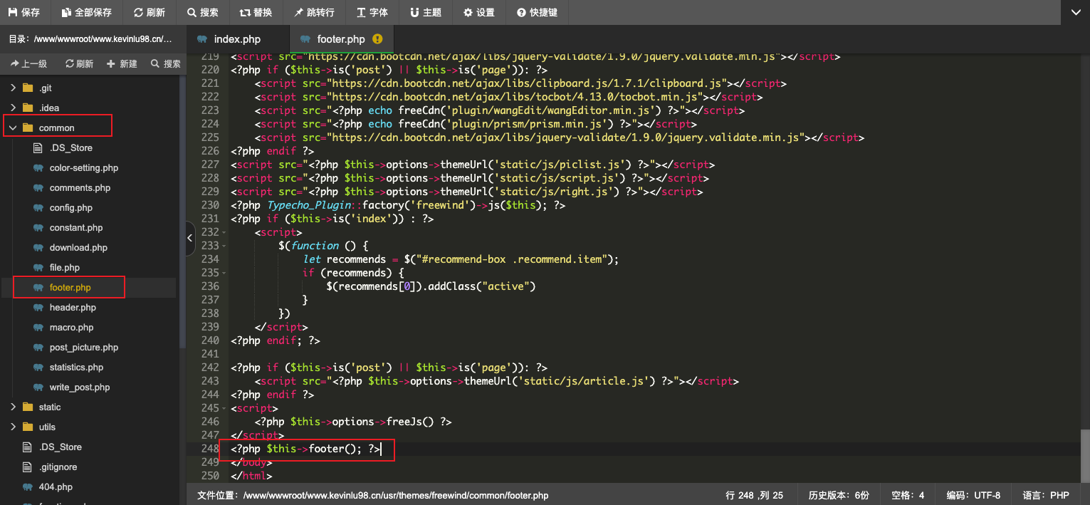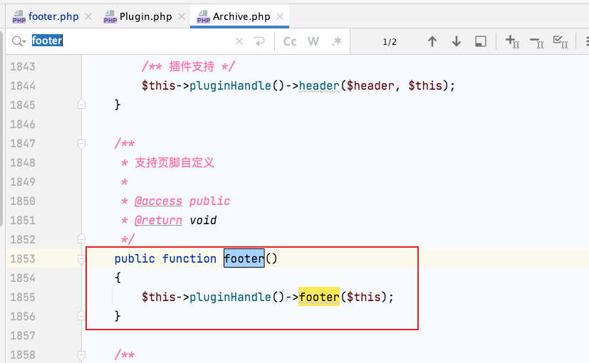 最近看到不少朋友反馈说很多插件用不了,因为我自己一直没有用过其它插件,所以这昨晚下载了几个插件查了下,发现大家都是挂载到Typecho_Plugin::factory('Widget_Archive')->footer下,然后我在类Widget_Archive中找到了挂载点,是在footer方法里,参考图一,我自己没有调用footer这个方法,导致页面上缺少该挂载点,大家在common/include.php下将 <?php $this->footer(); ?>放到